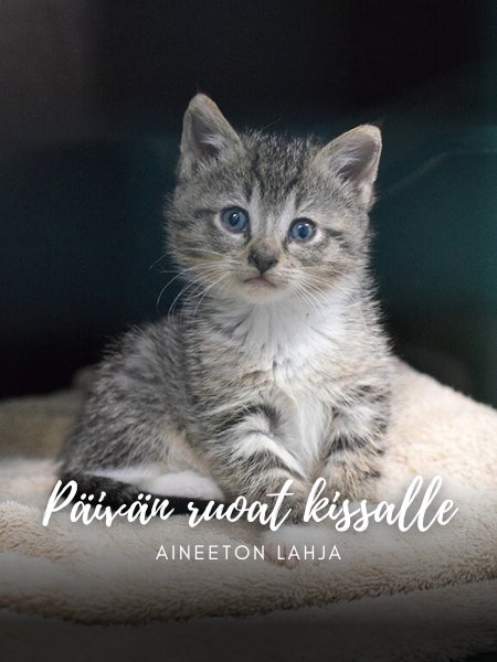 Lahjoitus kodittomalle kissalle, joka kattaa päivän ruoat.